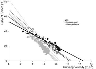 When looking at our data in more details, we saw that the difference in effectiveness between a world-class sprinter (French athlete Christophe Lemaitre, 9.92s on 100-m at the time of the study), his high-level teammates (national relay for some of them) and non-specialists (PE students and us researchers) was not clear at low running speeds, but very clear at high running speeds (see below). This means that better sprinters tend to produce a higher RF and thus a higher mechanical effectiveness (i.e. a more horizontally-oriented GRF) at high velocity, not at low velocity.
