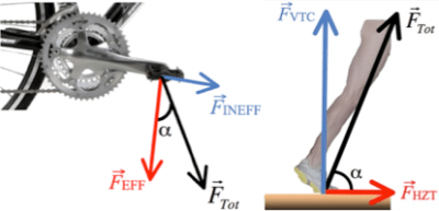 Mechanical effectiveness of force application. In pedaling (left), effectiveness is computed as the ratio between the effective component (FEFF which will cause the rotation of the drive) and the total i.e. resultant force produced by the active muscles (FTot). The other component (FINEFF) is inefficient. In sprint running (right), the analogy we propose here gives effectiveness as the ratio RF=FH/ FTOT. The analogy is not complete because in running, the other component (FVTC) is not useless.