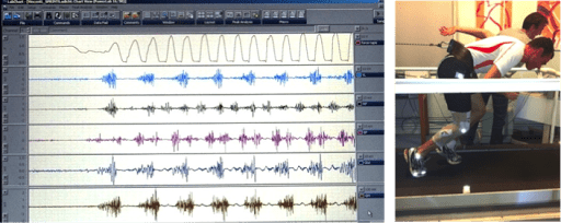 14 male sportsmen used to sprint (mainly rugby players and athletes) performed 6-s sprints on the instrumented motorized treadmill (see video) with synchronized EMG measurements on the main lower limb muscles, including biceps femoris and gluteus maximus. In order to have an idea of their muscular force capability (in both concentric and eccentric mode), we using isokinetic testing. No better possibility to assess a muscle group strength, alternative methods use simulation modeling to estimate muscle force. Not sure which approach is the most accurate, we chose the direct measurement, despite the non-functional movement and not realistic joint angular velocity…better than no measurement at all, plus we can reasonably assume that subjects kicking ass on the isokinetic machine actually have high force output capability.