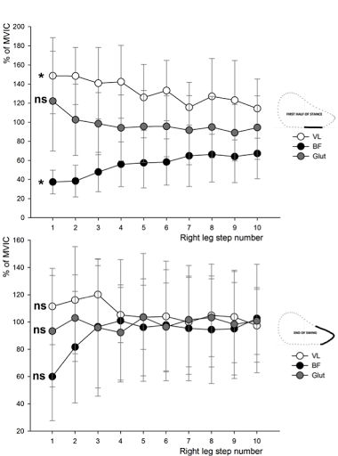 EMG activity of the vastus lateralis, gluteus maximus and biceps femoris muscles for all steps of the right leg during the 6-s acceleration. Uppe panel: early stance phase. Lower panel: end-of-swing phase.