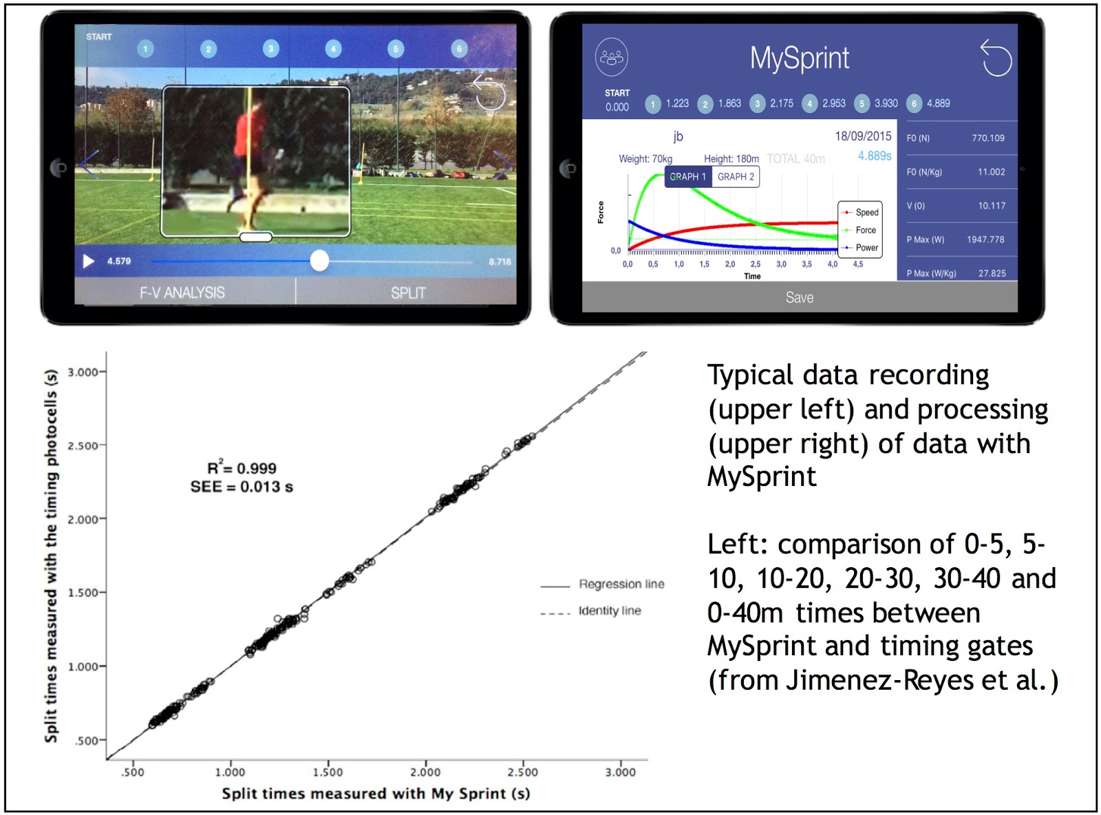 First, Pedro Jiménez-Reyes (PhD, UCAM, Murcia, Spain) has designed an iPhone/iPad application named MySprint. As seen in the promotional video below, this app allows easy and practical measurement of split times, and then runs the entire set of computations. We have no commercial relationship whatsoever with Pedro on this app, but our own practice and a paper under review show very high agreement between the split times measured with the app compared to both timing gates and radar devices. Our own comparisons clearly confirm those made by our Spanish colleagues in their submitted comparison study (see correlation below). Provided of course that the app instructions are thoroughly followed by the users…This app + the 240 fps device necessary (iPhone 6 or >, or iPad pro 9”7) is not a huge investment.
