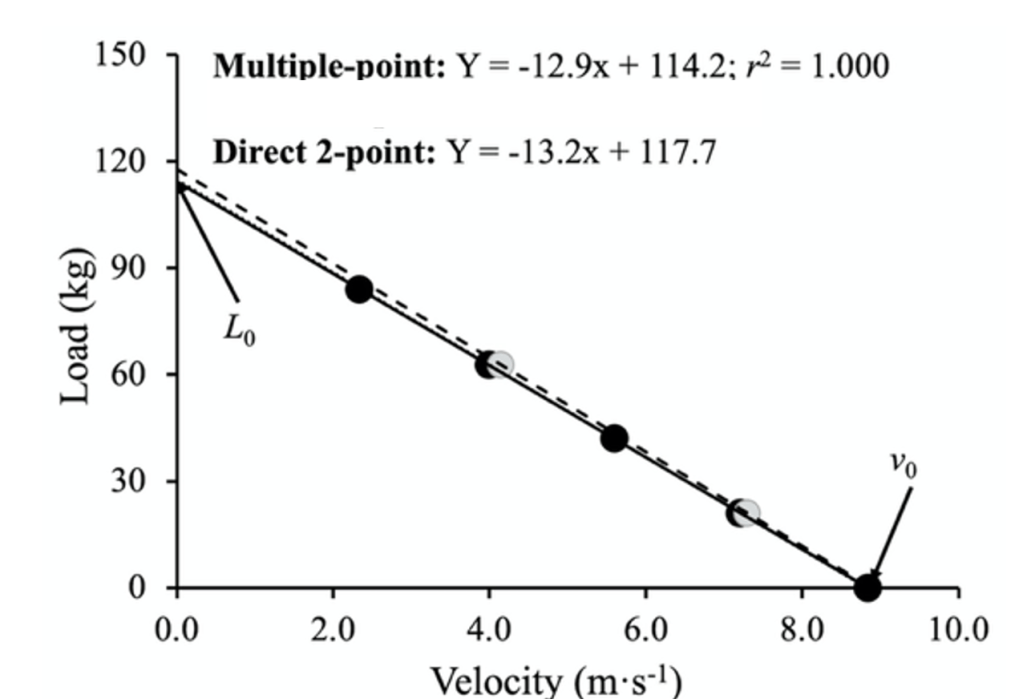 No data can be generated without running a test. However, for gym-based exercises such as the squat or bench press, the individual load-velocity relationship can be determined using only two loads since a linear relationship can be defined by two experimental points instead of four to five or more. This is the basis of the “2-point method” studied and well-established by Amador García-Ramos for resistance training exercises (see a complete literature review here). Basically, if the loads differ greatly (e.g., one light and one heavy), the linear relationship and extrapolated information obtained are not different from those obtained using a more complex, time-consuming, multiple-load protocol. Therefore, there is significant interest in the “2-point method”: less time and effort for athletes, less analysis time for staff, and the same data output.
