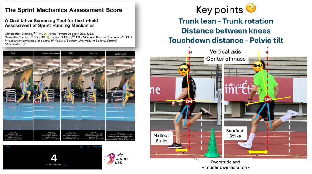 Chris Bramah has come up with a clinical score, the “S-MAS score”, to help cut through all the variables and time-consuming analyses that come with running biomechanics analysis. It gives you a quick summary of the most important features of the maximal speed sprint pattern linked to hamstring strain. On a scale from 0 to 12, the higher the score, the higher the theoretical strain. This score is based on 12 clinical-qualitative questions. They come from a slow-motion analysis of a sprint stride at top speed. It’s also part of the MyJumpLab package, which gives you the S-MAS score and the main segment angles.