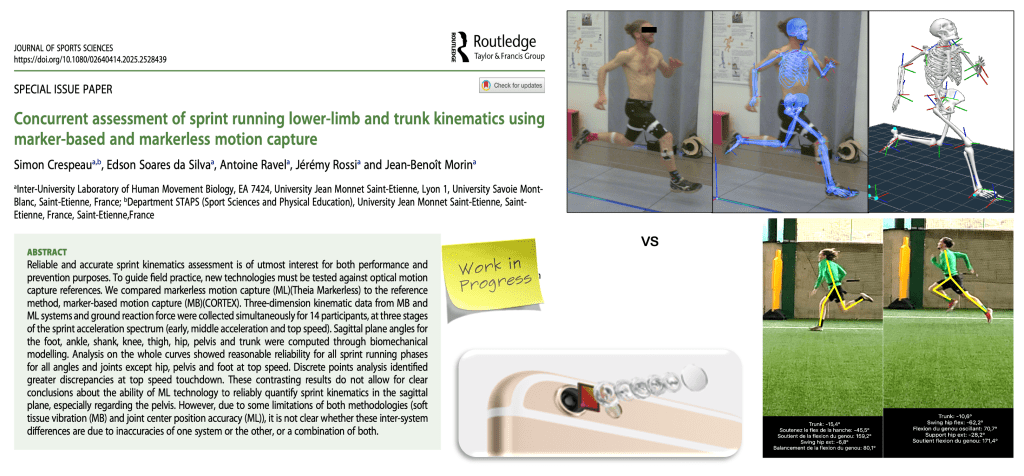 By 2025, we’d started working on how reliable these sprint mechanics measurements are. We’re using 3D motion capture systems in the lab as a reference, instead of markerless technology and simple 2D measurements, like the ones you can get from the MyJumpLab app. For example, we used this approach to describe the movements of high-level American football players (NCAA Division I) for the first time in a 2025 paper by Cameron Josse, a PhD student I’m supervising in collaboration with Ken Clark, who joined the Detroit Lions’ NFL staff in 2025. I’m also supervising another PhD student, Simon Crespeau, PT, who is currently working on these comparisons and his first 2025 paper was published in the Journal of Sports Sciences. This compared 2D markerless measurements (Theia system) to reference 3D motion capture. More to come in 2026.