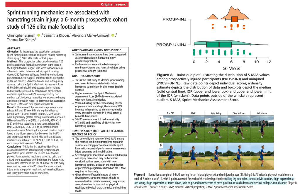 The most interesting paper of 2025 was the prospective cohort study led by Chris Bramah, which looked at professional English soccer. It showed that there’s a big link between “risky” sprint mechanics (a high S-MAS score) and both past and future hamstring injuries. So, as well as the clear links between sprint running mechanics (especially the positions and angles of the trunk, pelvis and lower limbs), there’s now proof that it’s linked to a higher risk of future hamstring injuries. This confirms pilot results from the 2017 study by Schuermans et al. Obviously, injuries come from many different causes, so we need to think about other factors like how much force is used during a sprint, how much force is produced when accelerating, how strong the hamstrings are on their own, mobility, control of the trunk, lower back and pelvis, and overall health habits. But when it comes to managing hamstring injuries, sprint kinematics can’t be ignored. This paper was published in the British Journal of Sports Medicine, one of the top journals in the field. We had already published an editorial in 2022 suggesting that the main injury mechanism (sprinting) should be at the centre of the problem.