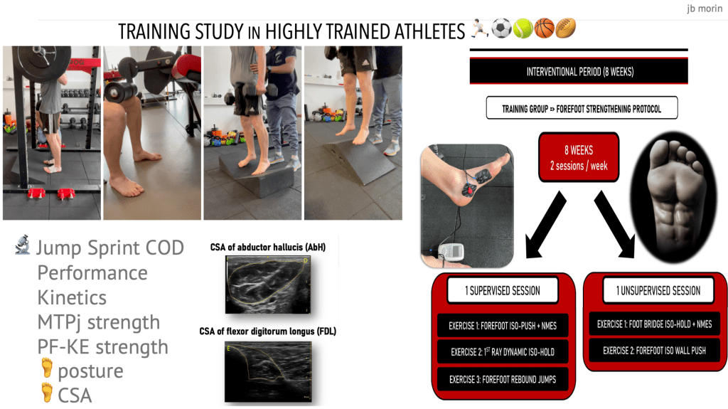 In this intervention study, we trained high-level athletes (basketball, athletics, tennis, and various high-intensity sports) for 8 weeks using exercises specifically designed to strengthen the MTP flexor muscles. The originality of our protocol was that contrary to previous studies, we followed strength training principles with significant overload and progressivity. In our case, overload was provided using additional load (for example loaded bar or dumbells in forward leaning or jumping on incline surfaces) or electrical stimulation applied directly to the foot muscles with a compex stimulation system. An indication that this program was closer to classic lower body strength programs rather than classic “foot strength” programs was that some participants (although highly trained and used to plyometric tasks and high-intensity sprints, jumps and changes of direction) reported pain and DOMS within the foot muscles after the first sessions…a good sign of stimulus and future effectiveness of the program.