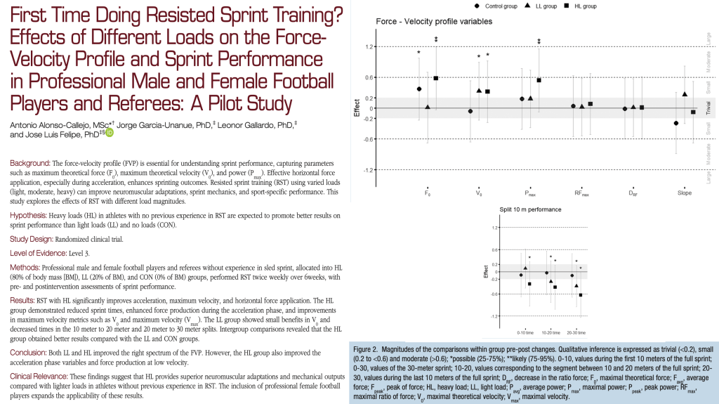 To confirm this, we did a detailed systematic review of the research, which was published in 2025. In the review, we looked at the results of training studies and used load as a factor. It doesn’t make sense to compare “Resisted Sprint Training” to “Unresisted Sprint Training” as some studies do, putting all of these under the same “RST” banner, from super light to super heavy loads. It’d be a bit like talking about gym “resistance training” without mentioning the different weights you use! It might sound unbelievable, but this is what most studies on RST have shown so far. This new meta-analysis is really interesting, especially the bit about squatting with heavy loads being better for increasing 1RM than squat jumps.