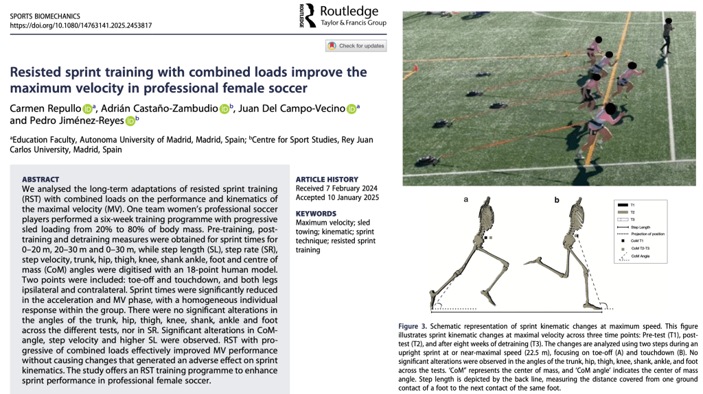 So, about that question of how training changes your sprint pattern (kinematics), a study from 2025 by Repullo and her team confirmed what we found in 2020: that athletes (here high-level women’s football players) didn’t show any major changes in their running mechanics after a pretty tough RST programme. As lots of coaches have been asking about this, it’s worth remembering that the only two studies done so far on maximal speed running mechanics after a heavy RST programme have shown the same thing: no change. We chat about this and other related topics in the Football Fitness Federation Podcast here: