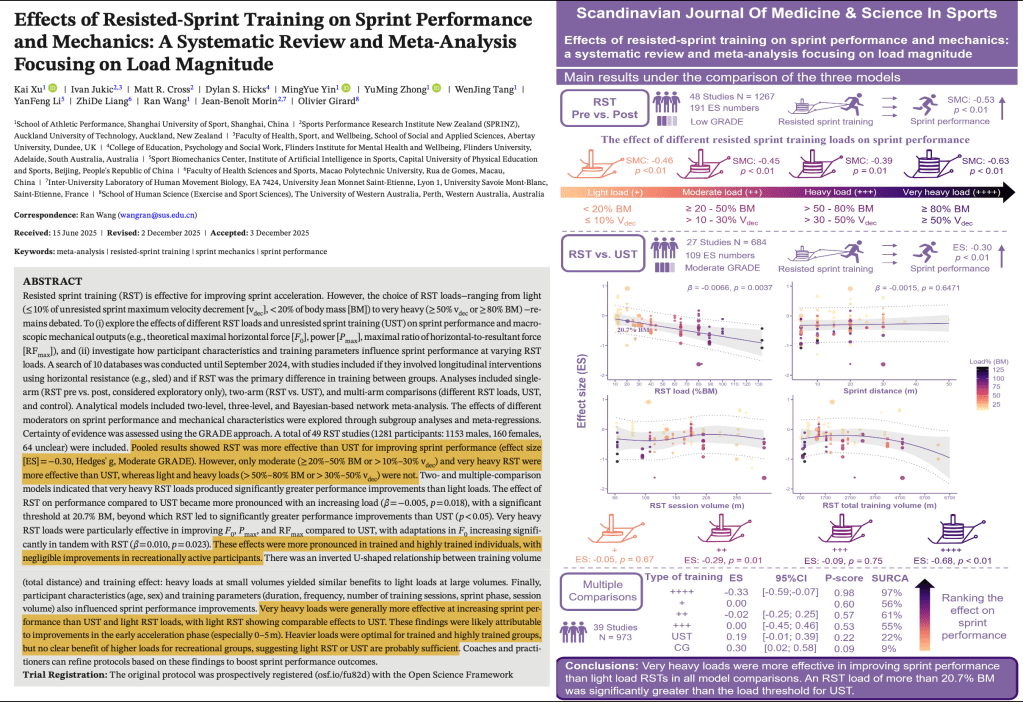 This meta-analysis confirms that the effects of RST depend on the load, which is why it’s important to consider the individual load-velocity relationship to correctly set training loads, as I explained in my previous blog post. I hope RST studies will only propose individualised, load-velocity based programmes, instead of non-individualised loads. When it comes to training, our meta-analysis shows that RST should be designed with loads set as a function of the targeted gains (early acceleration, maximal power output, maximal speed, etc.) to follow the load specificity described in our study. When it comes to early acceleration metrics, heavy resistance is the way to go.